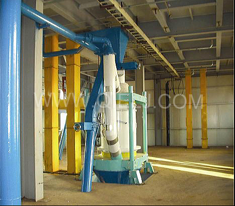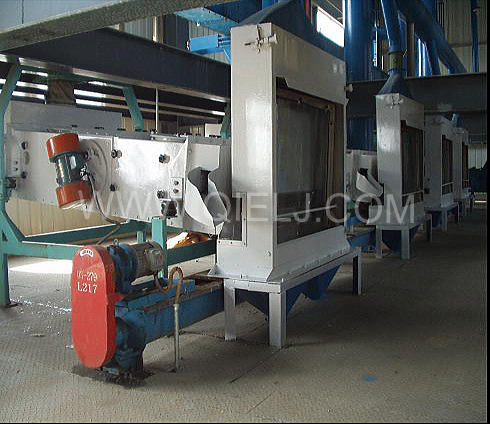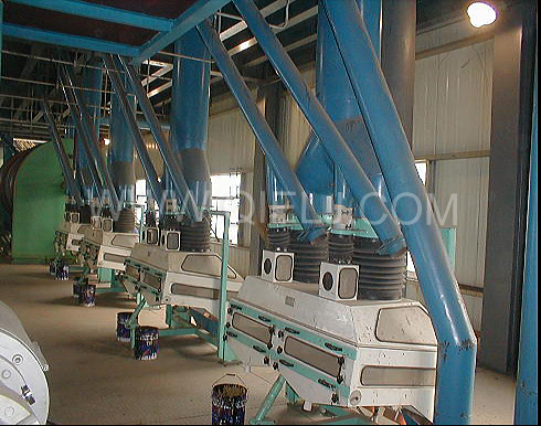 清理工序:采用磁選器去除鐵雜;振動清理篩去除大雜、秸稈等;比重去石機去除石子和磚塊等重雜;除塵系統(tǒng)采用單聯(lián)剎克龍以及離心風機進行有效的除塵,以保證車間衛(wèi)生和清理輕雜。